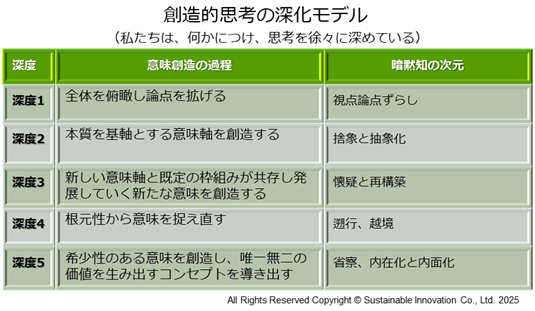 当社の「意味創造推論AI」は、企業の念願であった主題を「〇〇を主題として、●●を図り、ディスラプションへと導いていく」の書式に表現して入力し、「視点論点ずらし」により新たな意味への転回可能な候補群を創造し(深度1)、そこから次第に、基軸となる意味軸(深度2)、新次元の意味(深度3)、根元的な意味(深度4)、希少性のある意味(希少性の価値の源泉となる意味、私だけの唯一無二の価値となる意味=コンセプト、深度5)へと創造的思考を深めていきます(下図「創造的思考の深化モデル」参照。詳細は こちらのコラム をご覧ください)。