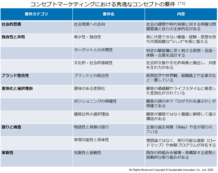 (*1) Copilot情報源 Copilotが総合的に構成した独自の定義。破壊的イノベーション(クレイトン・クリステンセンによる理論)、コンセプト・ドリブン・デザイン(ロベルト ベルガンティによる製品やサービスの設計において機能や技術ではなく「思想」や「社会的文脈」を起点とするアプローチ)、ブランド・アイデンティティ論(ジャン・ノエル・カペフェレやデイヴィッド・アーカーらによるブランドの哲学と社会的役割に関する理論、社会的共創(顧客や社会との対話を通じて価値を生み出すという近年のマーケティング・イノベーション論)、文化的共鳴(コンセプトが社会や文化と共鳴することで、単なる商品を超えた意味を持つという考え方)