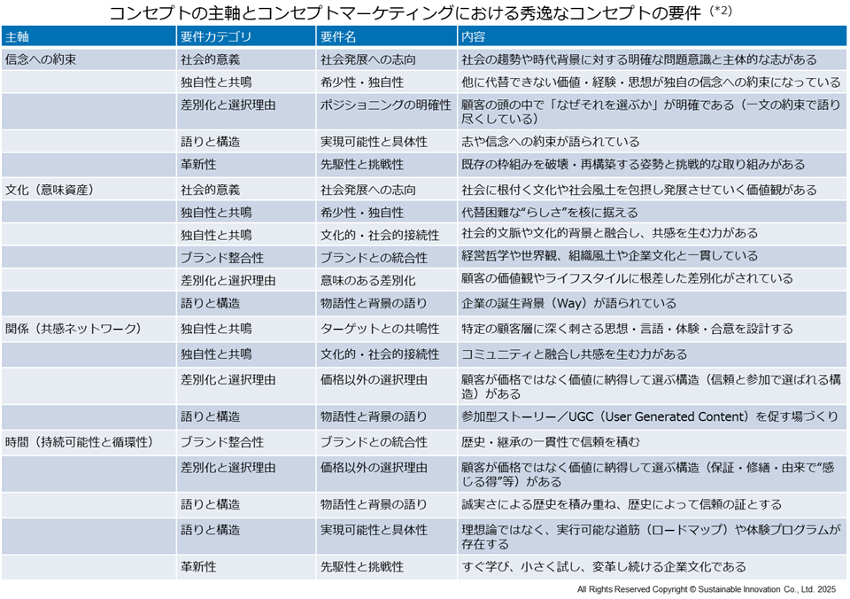 ここで挙げた普遍軸は「秀逸なコンセプト」の必要条件であり、「信念への約束」は十分条件となっています。そして、先の「コンセプトマーケティングにおいて本質的に求められるコンセプトの要件」を「秀逸なコンセプト」と融合させることも可能になります(下図参照、当社において編集した)。