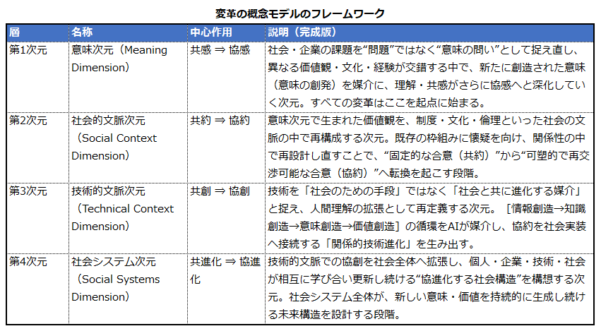 - 第4次元:社会システム次元(Social Systems Dimension):この次元では、技術的文脈の「共創」⇒「共進化」の流れを結合させて、社会全体の「協創」⇒「協進化」の流れを実現します。ここで目指すのは、社会・個人・AIが相互に作用しながら、学び合い、自己を更新し続ける社会システムの概念モデルの構想です。