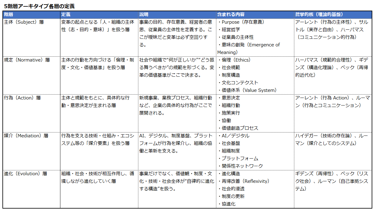 5階層アーキタイプは、企業が「意味」から事業を再構築し、社会とともに進化するための“普遍的な思考構造”を整理したもの。どんな事業・業界でも、変革は必ず[主体 → 規定 → 行為 → 媒介 → 進化]という5つのステップを踏むため、その普遍構造を定式化した枠組みです。
