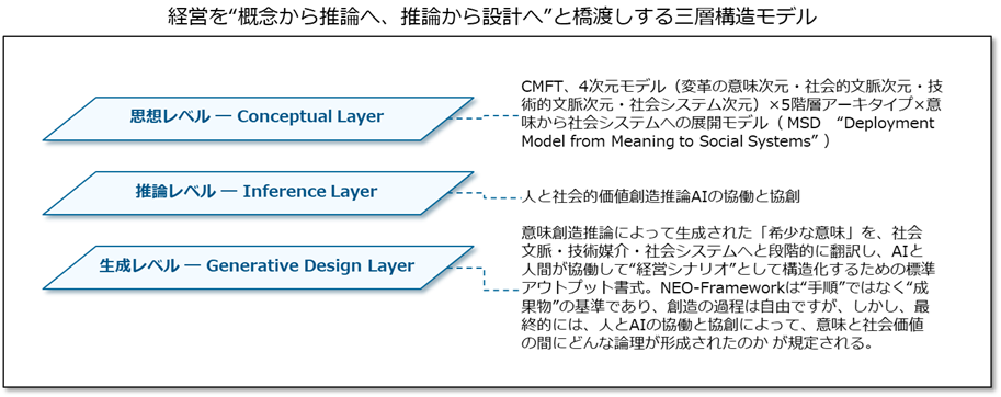 その本質は、経営を“概念から推論へ、推論から設計へ”と橋渡しする3層構造として成立している点にあります。
