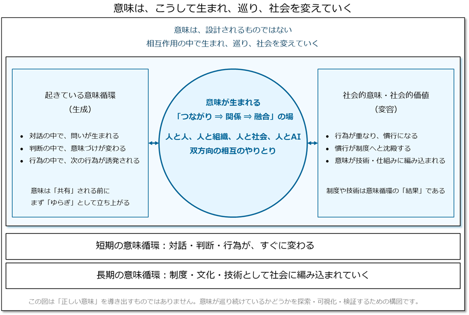 意味は、対話の中で生まれ、判断の中で形になり、行為の中で社会に現れます。