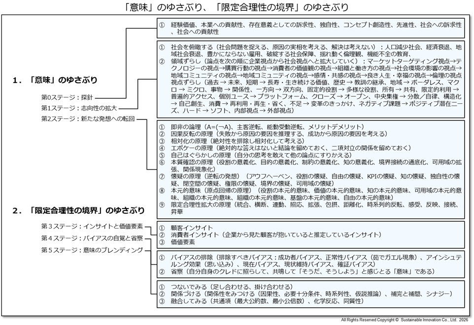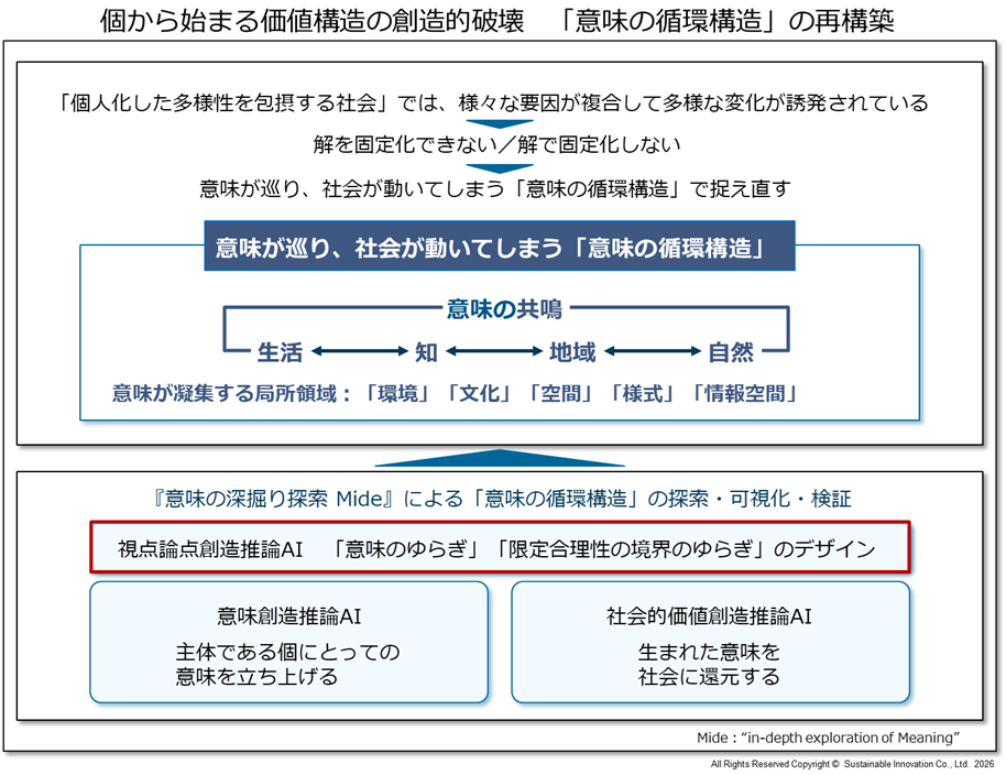 「意味」のゆさぶりは、個が当然視している価値や前提を問い直し、新たな志向性と発想を立ち上げるプロセスです。一方、「限定合理性の境界」のゆさぶりは、組織や社会に無意識に埋め込まれた判断枠組みやバイアスを可視化し、その外部へと思考を拡張する営みです。両者の往還により意味は更新され、循環が起動し、個から始まる価値構造の創造的破壊が実現されます。