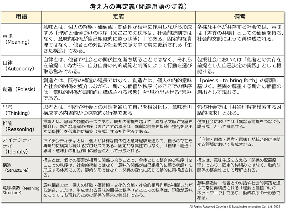 - 意味創造推論AIは、単なる「情報生成」ではなく、人とAIが共に意味を生み出す “to bring forth meaning” ことを目的とする、創造型AIの一形態である。人間の感性・倫理・想像力とAIの分析・統合・仮説形成能力とが協創的プロセス(co-poietic process)として結びつき、「自律」「思考」「創造」「アイデンティティ」が統合的に連関する領域において、多様な他者との関係性の中で新たな意味構造を創造するものである。