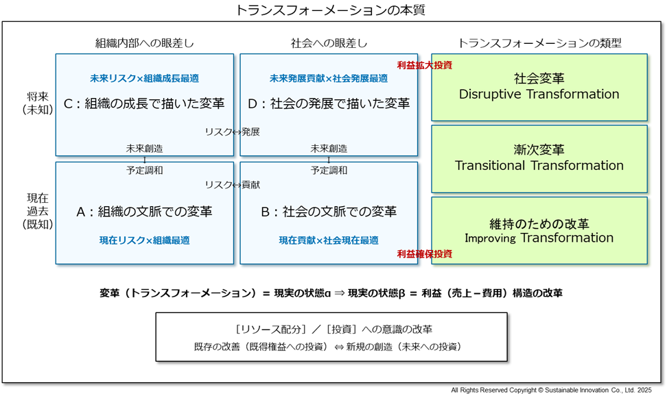 - 「組織内部への眼差し」か「社会の眼差し」、および、「現在」を見て、あるいは、「将来」を考えて行うかで、その様相は「社会変革」、「移行への漸次変革」、「現状の維持の改革」と異なります(下図「トランスフォーメーションの本質」参照)。