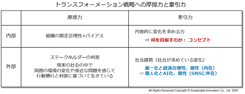 - 今すぐに何をすべきか? それは、何を目指すのかを明確にすることです。まずは「コンセプト」を打ち出すこと、そしてそれを基準に内発的に変化を求めることです(下図「トランスフォーメーション戦略への摩擦力と牽引力」参照)。